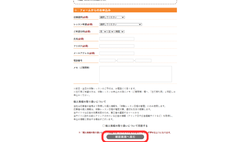 入力フォーム画面に行きますので、希望日や氏名を入力して、「確認画面へ進む」をクリック。